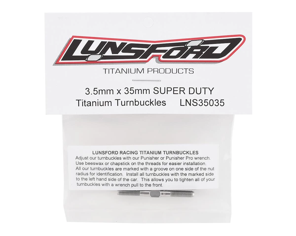 This is a pack of two Lunsford 3.5x35mm “Super Duty” Titanium Turnbuckles. These turnbuckles are CNC machined and thread rolled in house from domestic US 6AL/4V grade titanium. If you want to put your car on a diet, this is one of the best places to start eliminating weight, without sacrificing strength.