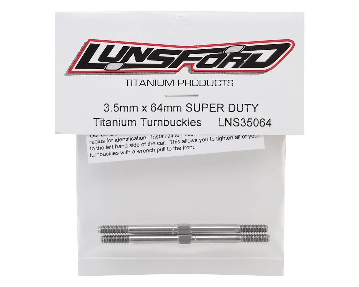 This is a pack of two Lunsford 3.5x64mm “Super Duty” Titanium Turnbuckles for general use. Lunsford turnbuckles are CNC machined and thread rolled from domestic US 6AL/4V grade titanium. If you want to put your car on a diet, this is one of the best places to start eliminating weight, without sacrificing strength.  Â