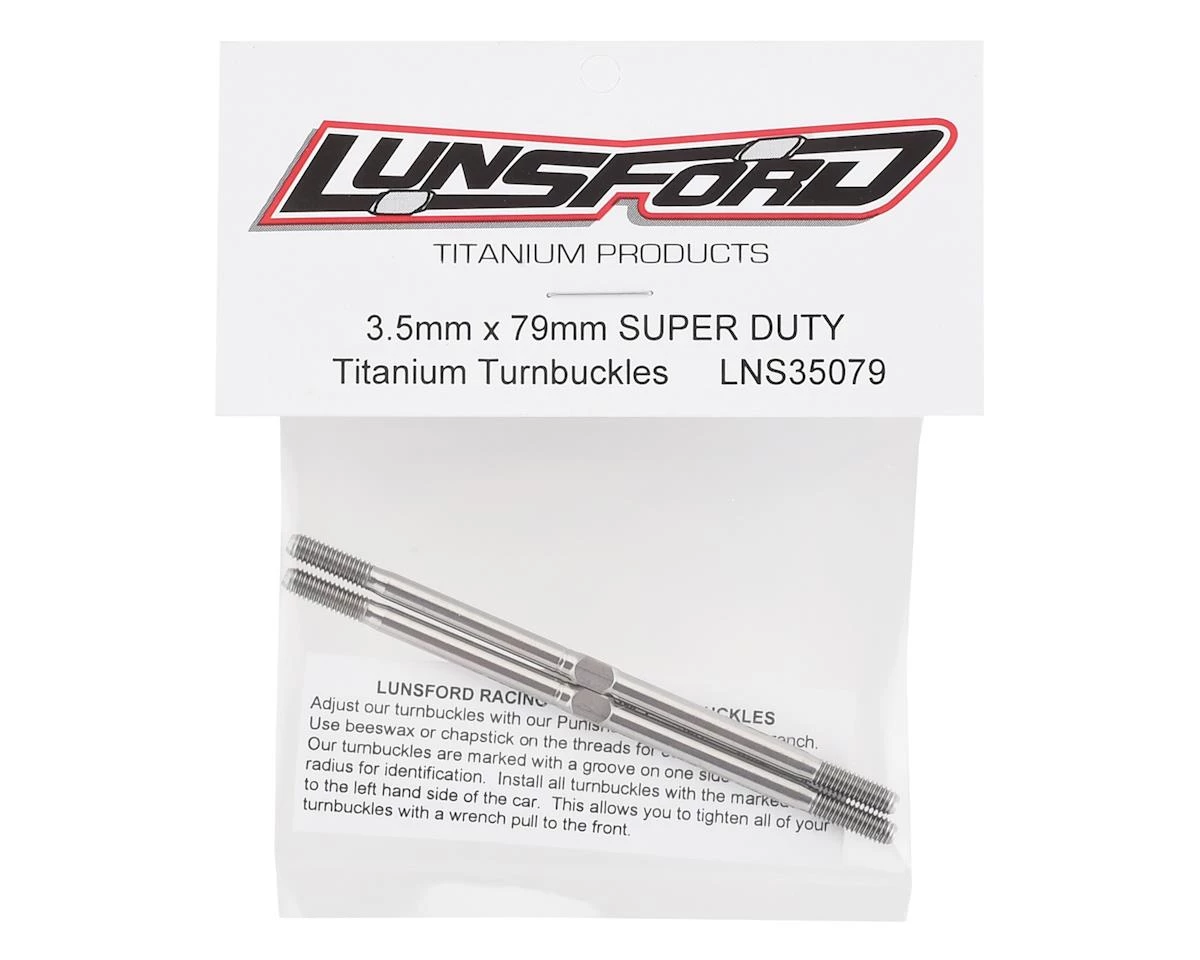 This is a pack of two Lunsford 3.5x79mm “Super Duty” Titanium Turnbuckles. These turnbuckles are CNC machined and thread rolled in house from domestic US 6AL/4V grade titanium. If you want to put your car on a diet, this is one of the best places to start eliminating weight, without sacrificing strength.