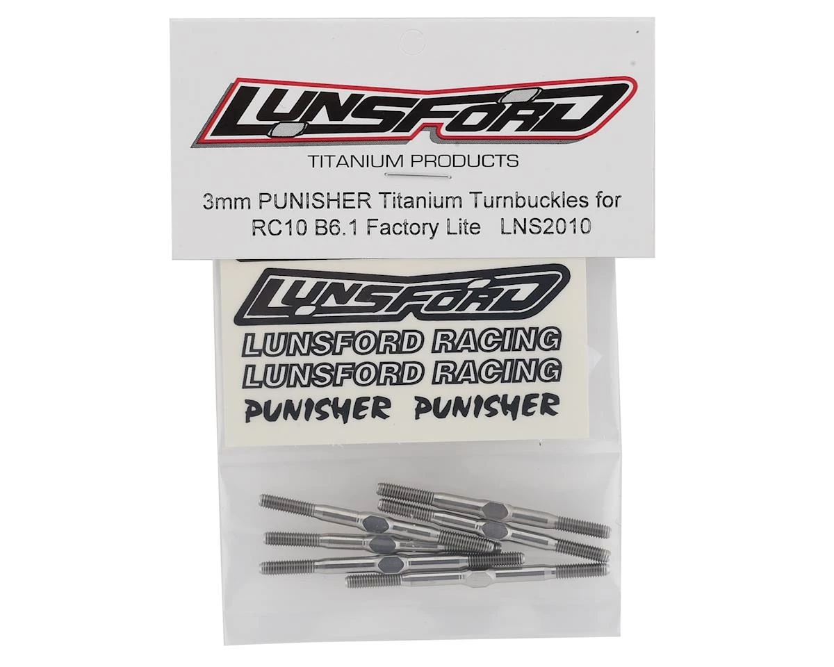 This is an optional Lunsford 3mm RC10B6.1 Factory Lite “Punisher” Titanium Turnbuckle Kit. Lunsford turnbuckles are CNC machined and thread rolled in house from domestic US 6AL/4V grade titanium. If you want to put your car on a diet, this is one of the best places to start eliminating weight, without sacrificing strength.Â
