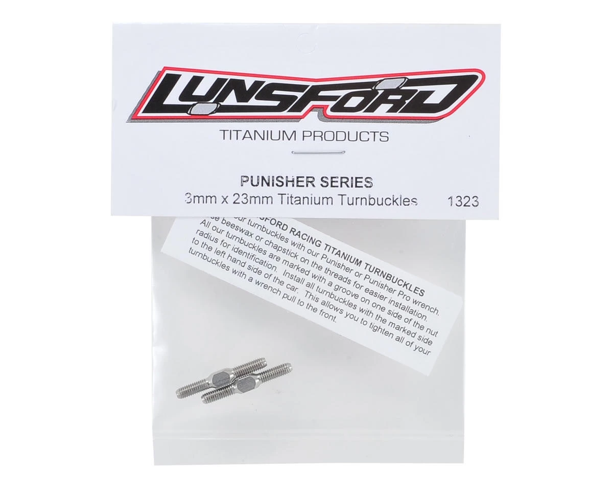 This is a pack of two Lunsford 3x23mm “Punisher” Titanium Turnbuckles. These turnbuckles are CNC machined and thread rolled in house from domestic US 6AL/4V grade titanium. If you want to put your car on a diet, this is one of the best places to start eliminating weight, without sacrificing strength.