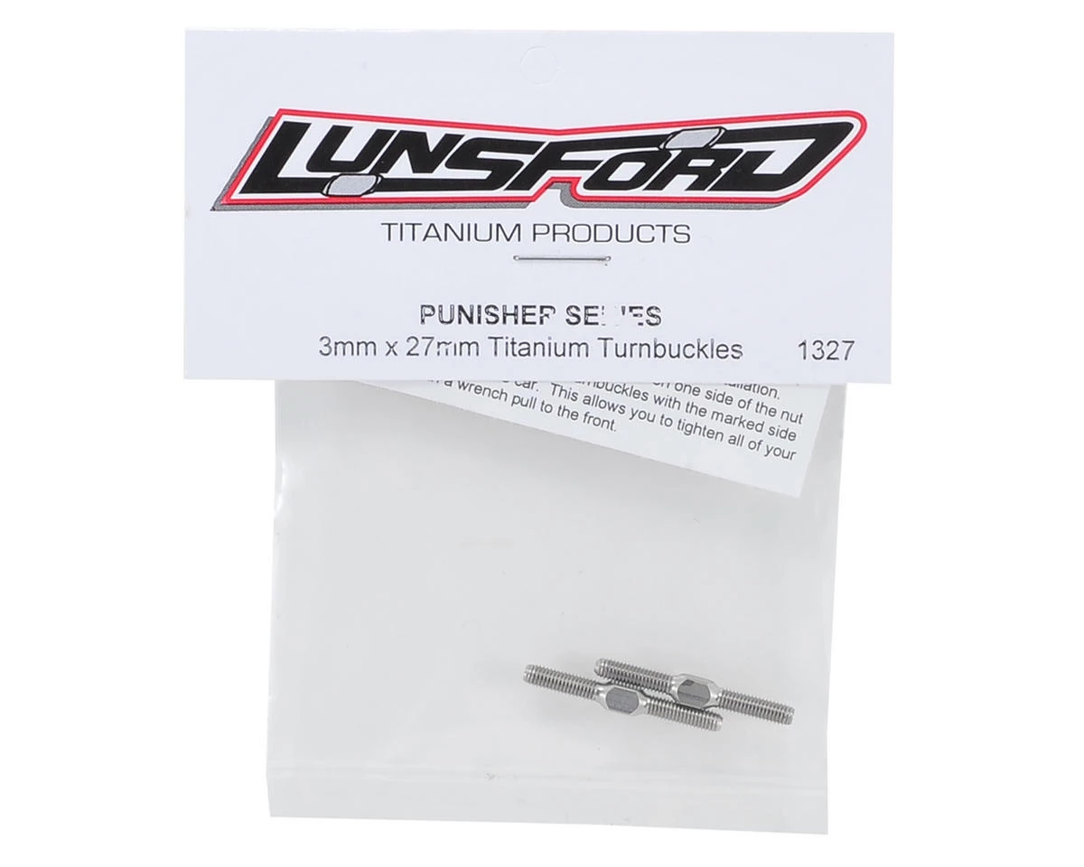 This is a pack of two Lunsford 3x27mm “Punisher” Titanium Turnbuckles. These turnbuckles are CNC machined and thread rolled in house from domestic US 6AL/4V grade titanium. If you want to put your car on a diet, this is one of the best places to start eliminating weight, without sacrificing strength.