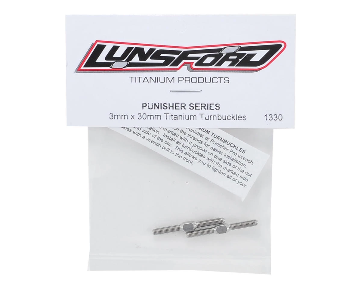 This is a pack of two Lunsford 3x30mm “Punisher” Titanium Turnbuckles. These turnbuckles are CNC machined and thread rolled in house from domestic US 6AL/4V grade titanium. If you want to put your car on a diet, this is one of the best places to start eliminating weight, without sacrificing strength.