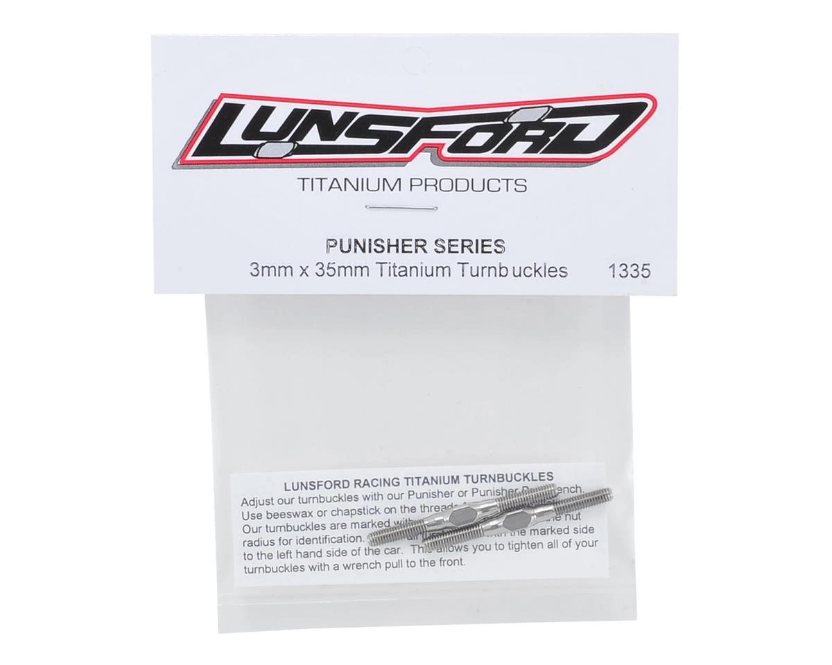 This is a pack of two Lunsford 3x35mm “Punisher” Titanium Turnbuckles. These turnbuckles are CNC machined and thread rolled in house from domestic US 6AL/4V grade titanium. If you want to put your car on a diet, this is one of the best places to start eliminating weight, without sacrificing strength.