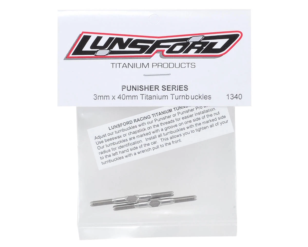 This is a pack of two Lunsford 3x40mm “Punisher” Titanium Turnbuckles. These turnbuckles are CNC machined and thread rolled in house from domestic US 6AL/4V grade titanium. If you want to put your car on a diet, this is one of the best places to start eliminating weight, without sacrificing strength.