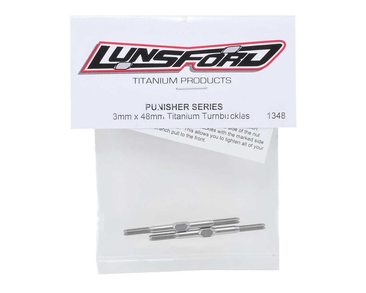 This is a pack of two Lunsford 3x48mm “Punisher” Titanium Turnbuckles. These turnbuckles are CNC machined and thread rolled in house from domestic US 6AL/4V grade titanium. If you want to put your car on a diet, this is one of the best places to start eliminating weight, without sacrificing strength.