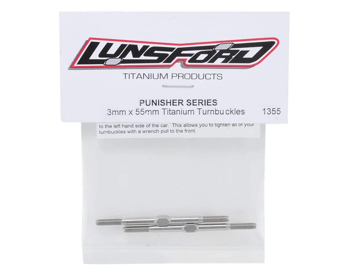 This is a pack of two Lunsford 3x55mm “Punisher” Titanium Turnbuckles. These turnbuckles are CNC machined and thread rolled in house from domestic US 6AL/4V grade titanium. If you want to put your car on a diet, this is one of the best places to start eliminating weight, without sacrificing strength.