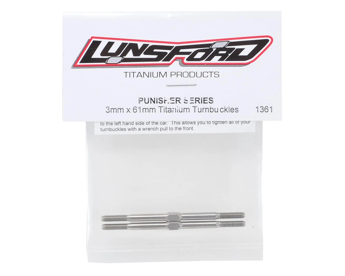 This is a pack of two Lunsford 3x61mm “Punisher” Titanium Turnbuckles. These turnbuckles are CNC machined and thread rolled in house from domestic US 6AL/4V grade titanium. If you want to put your car on a diet, this is one of the best places to start eliminating weight, without sacrificing strength.