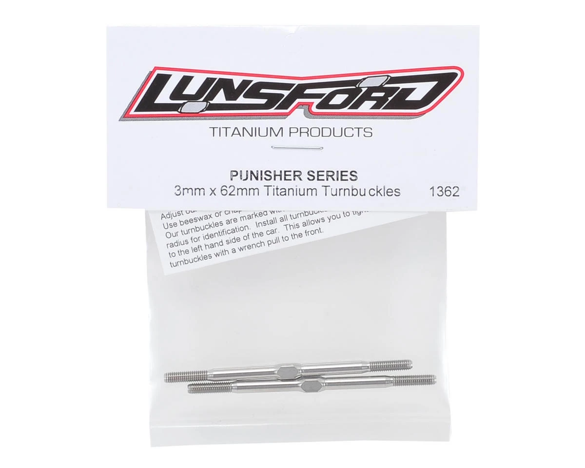 This is a pack of two Lunsford 3x62mm “Punisher” Titanium Turnbuckles. These turnbuckles are CNC machined and thread rolled in house from domestic US 6AL/4V grade titanium. If you want to put your car on a diet, this is one of the best places to start eliminating weight, without sacrificing strength.
