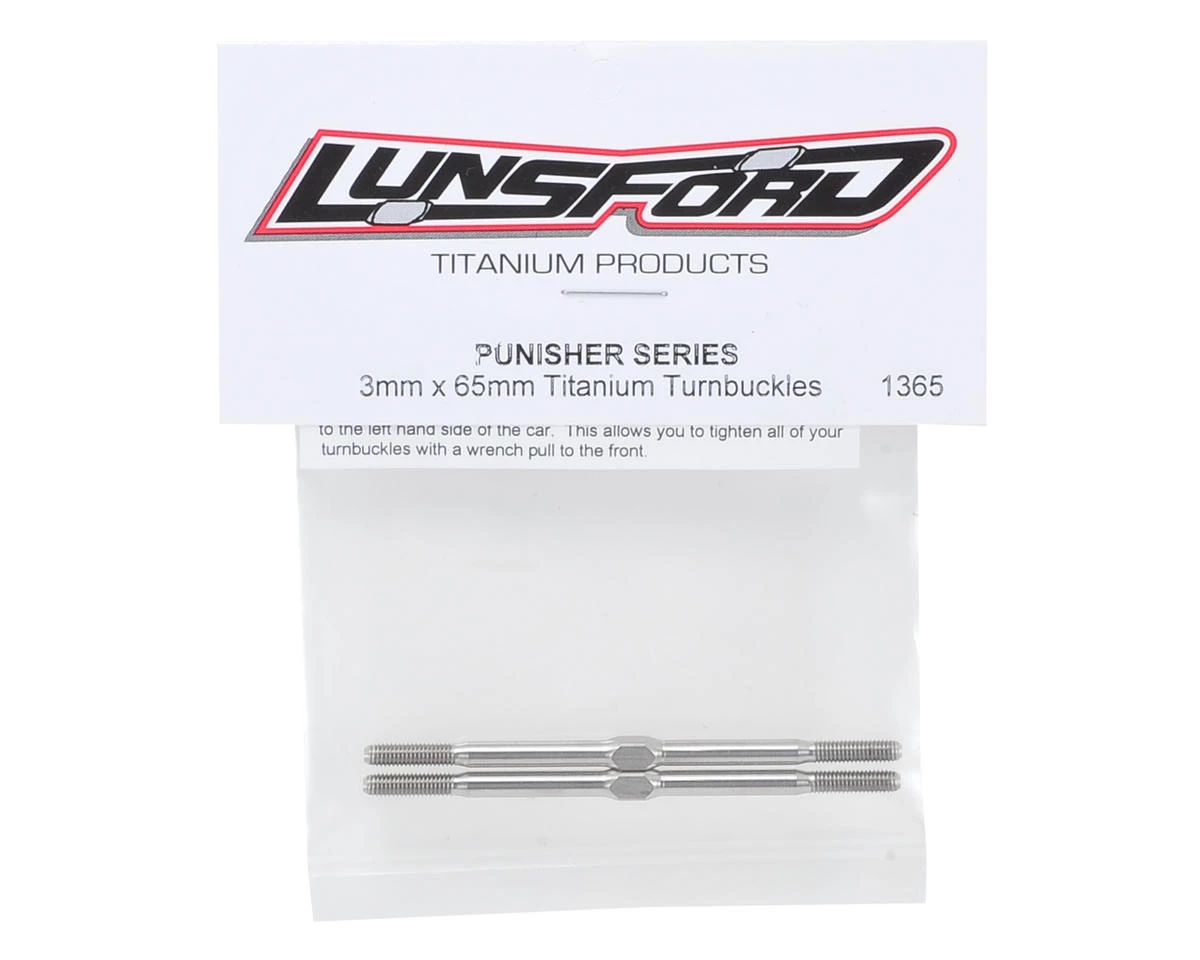 This is a pack of two Lunsford 3x65mm “Punisher” Titanium Turnbuckles. These turnbuckles are CNC machined and thread rolled in house from domestic US 6AL/4V grade titanium. If you want to put your car on a diet, this is one of the best places to start eliminating weight, without sacrificing strength.