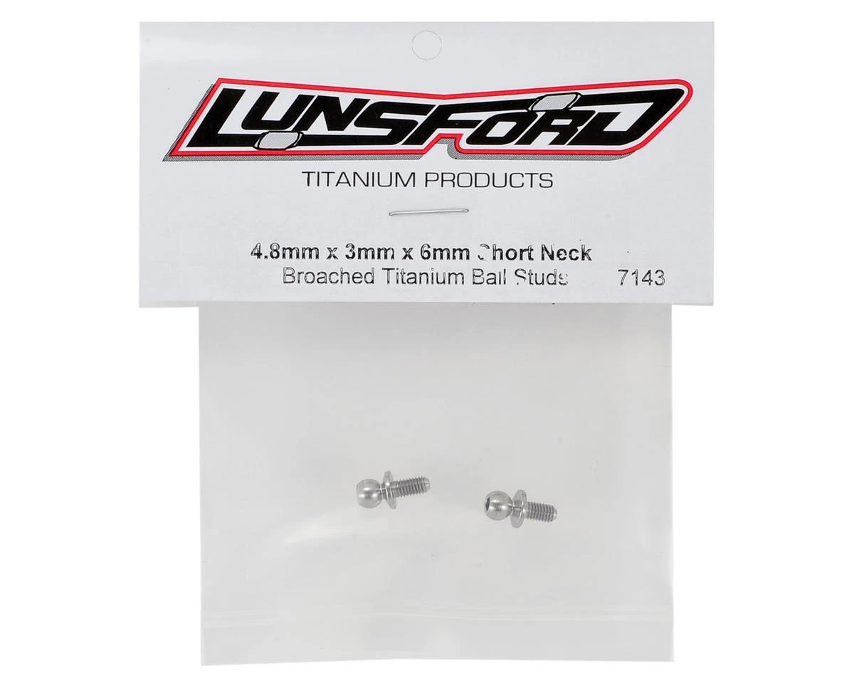 This is a pack of two Lunsford 4.8mm Short Neck Broached Titanium Ball Studs. Get the strongest combination of all time when you combine Lunsford turnbuckles with these titanium ball studs! All Lunsford ball studs are CNC micro finished from 6AL/4V titanium. The ball diameter is 4.8mm, the thread size is 3mm and the thread length is 6mm.