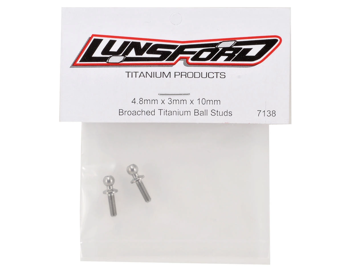 This is a pack of two Lunsford 4.8x10mm Broached Titanium Ball Studs, and are intended for use with the Associated SC10 4×4, as well as any other vehicle that uses the same size ball stud. Get the strongest combination of all time when you combine Lunsford turnbuckles with these titanium ball studs! All Lunsford ball studs are CNC micro finished from 6AL/4V titanium. The ball diameter is 4.8mm, the thread size is 3mm and the thread length is 10mm.
