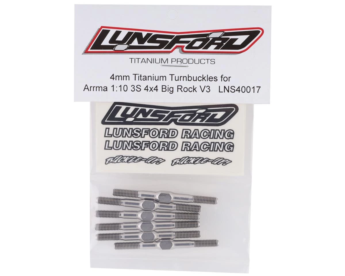 This is a Lunsford Arrma Big Rock 3S V3 “Super Duty” Titanium Turnbuckle Kit. Lunsford turnbuckles are CNC machined and thread rolled in house from domestic US 6AL/4V grade titanium. If you want to put your car on a diet, this is one of the best places to start eliminating weight, without sacrificing strength.