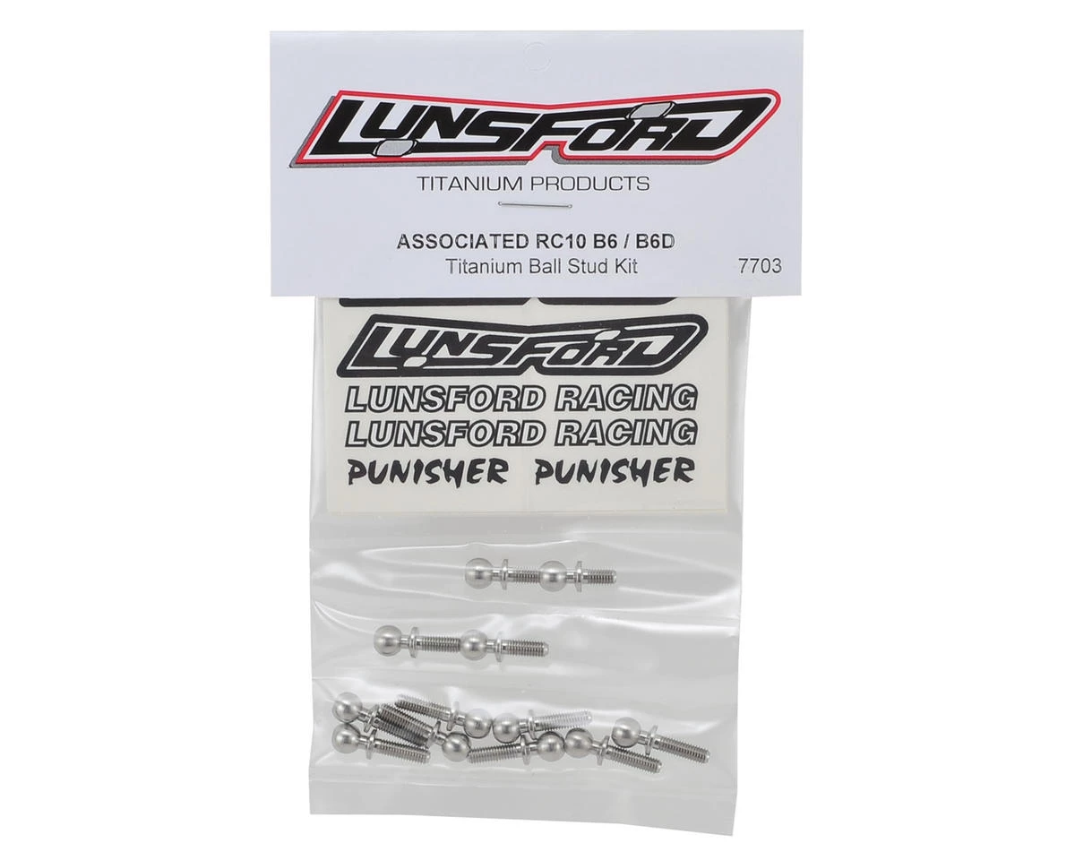 This is an optional Lunsford Titanium Ball Stud Kit, intended for use with the Associated RC10 B6 and B6D buggies. Combine these with Lunsford turnbuckles to get the strongest combination available! All Lunsford ball studs are CNC micro-finished from 6AL/4V titanium.