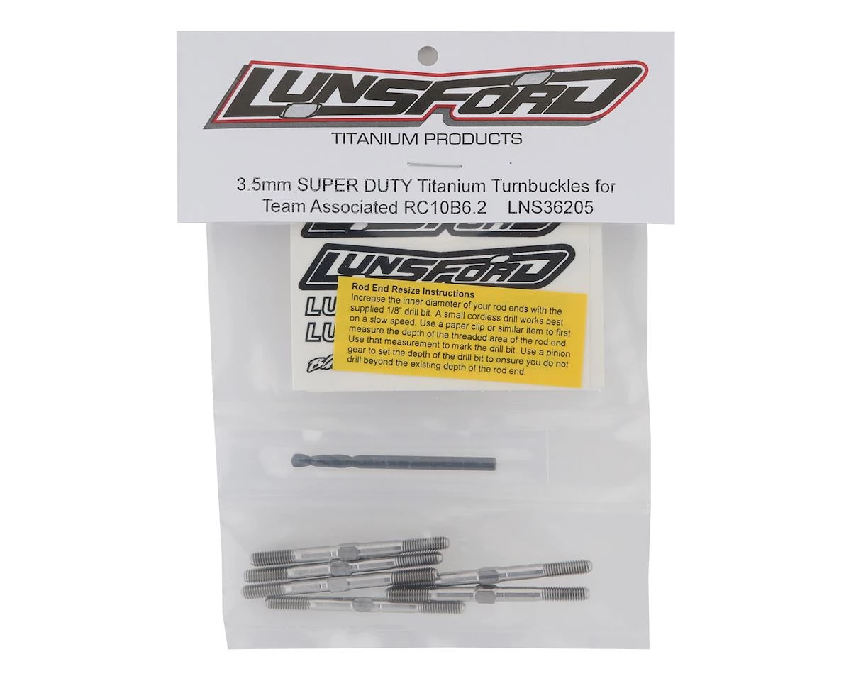 This is an optional Lunsford Associated RC10B6.2 “Super Duty” Titanium Turnbuckle Kit. If you run on high bite clay, AstroTurf or carpet, 3.5mm SUPER DUTY turnbuckles are a must. Additionally, the turnbuckle sizes below are different than stock lengths to better suite different adjustment settings and proper turnbuckle to ball cup engagement.