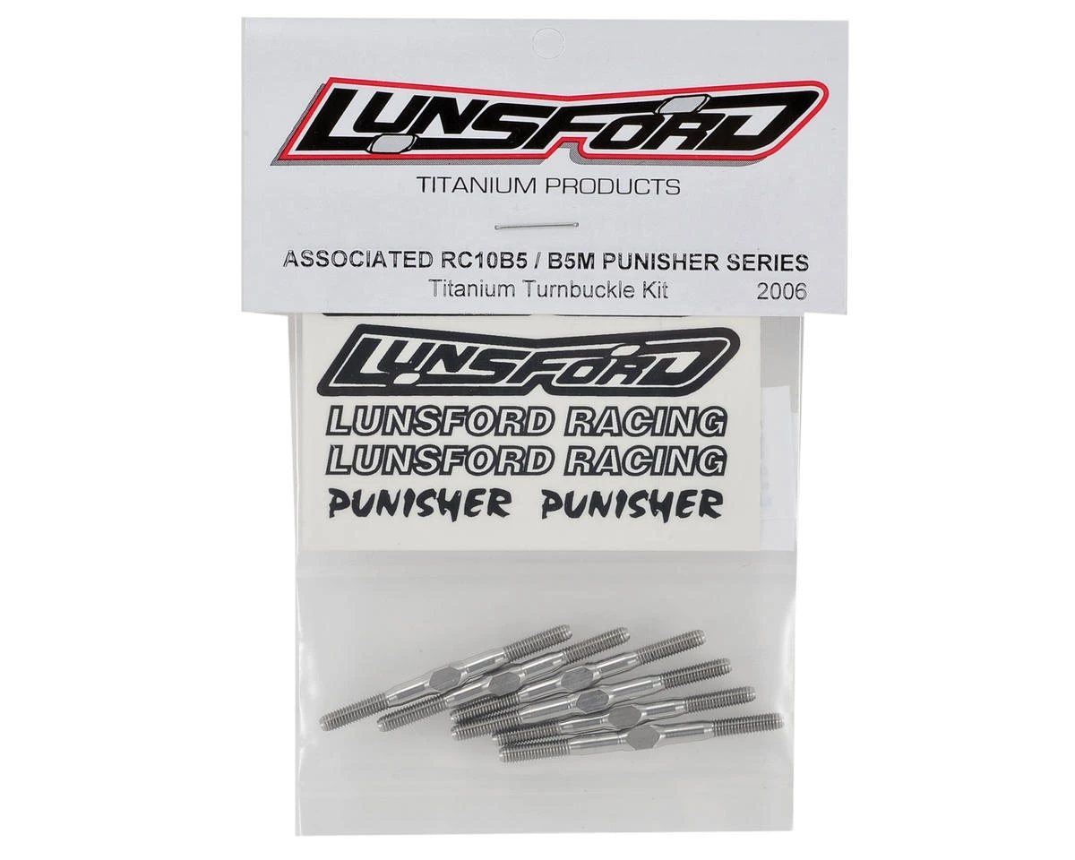 This is a Lunsford “Punisher” Titanium Turnbuckle Kit, intended for use with the Associated B5 and B5M 1/10 scale buggies. These turnbuckles are CNC machined and thread rolled from domestic US 6AL/4V grade titanium. If you want to put your car on a diet, this is one of the best places to start eliminating weight, without sacrificing strength. Plus they work with the stock B5 ball cups, making this a simple upgrade that will reduce weight and increase strength, delivering a dramatic performance gain.Â