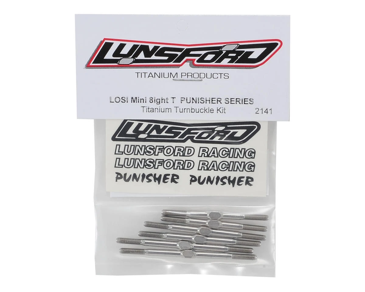 This is a optional Lunsford “Punisher” Titanium Turnbuckle Kit, intended for use with the Losi Mini 8IGHT-T Electric Truggy. Lunsford turnbuckles are CNC machined and thread rolled in house from domestic US 6AL/4V grade titanium. If you want to put your car on a diet, this is one of the best places to start eliminating weight, without sacrificing strength.Â