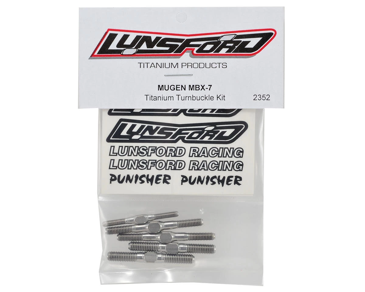 This is a pack of five Lunsford “Punisher” Titanium Turnbuckles and are intended for use with the Mugen MBX7. These turnbuckles are CNC machined and thread rolled in house from domestic US 6AL/4V grade titanium. If you want to put your car on a diet, this is one of the best places to start eliminating weight, without sacrificing strength.
