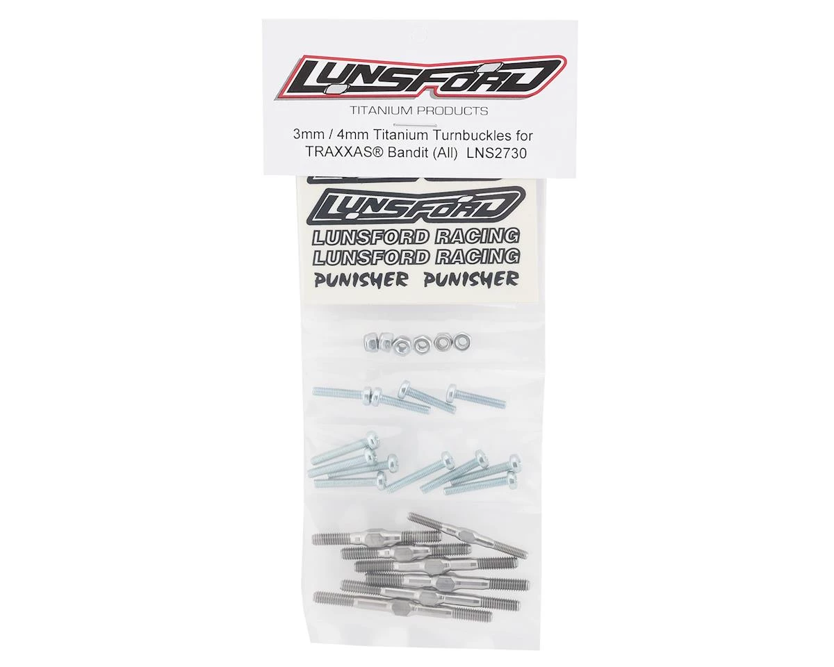 The Lunsford “Punisher” Traxxas Bandit Titanium Turnbuckle Kit is a 4mm Titanium Turnbuckle upgrade kit that greatly increases turnbuckle strength. This kit is especially designed for those that currently have plastic links, are using older generation 3mm diameter turnbuckles, or for those that want a stronger option than Chinese steel. All camber and steering turnbuckles have been upgraded to 4mm. If you are upgrading from plastic links or 3mm links you will need the Traxxas rod ends listed below. Lunsford includes fasteners where needed.