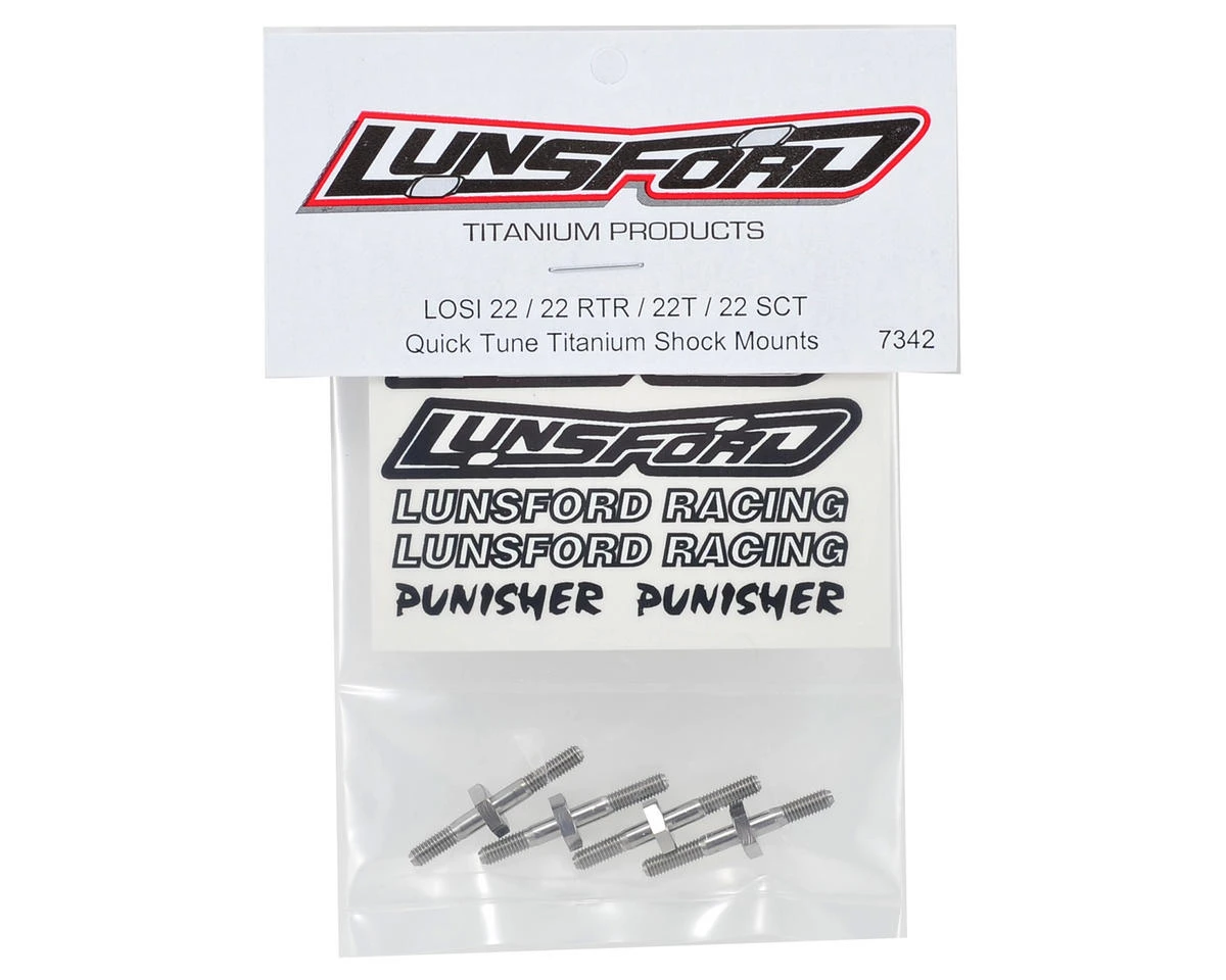 This is an optional Lunsford “Quick Tune” Titanium Shock Mount Kit, and is intended for use with Losi 22 1/10 buggy. Lunsford Quick Tune titanium shock mounts were invented by racers for racers, and are geared towards the hardcore ‘tuning’ enthusiast. By removing just one nylock nut, the shock can be quickly moved to any shock tower position. The quality is the same as for all Lunsford parts. Precision CNC machined from domestic 6AL/4V titanium to exact tolerance. These shock mounts have been around since the mid ’90s and if you’re a diehard tuner, these are highly recommended.Â
