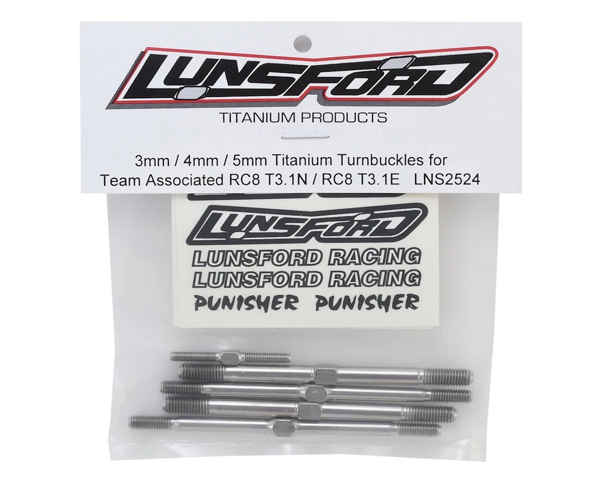 This is an optional Lunsford “Punisher” Titanium Turnbuckle Kit for the Team Associated RC8T3.1 Nitro Truggy, and the RC8T3.1e Electric Truggy. Lunsford Titanium Turnbuckles are a must have upgrade for your RC model. Lunsford CNC machines and thread rolls all of their turnbuckles in-house from domestic 6AL/4V titanium. If you want to put your car on a diet, this is one of the best places to start eliminating weight, without sacrificing strength. Made in the USA.Â