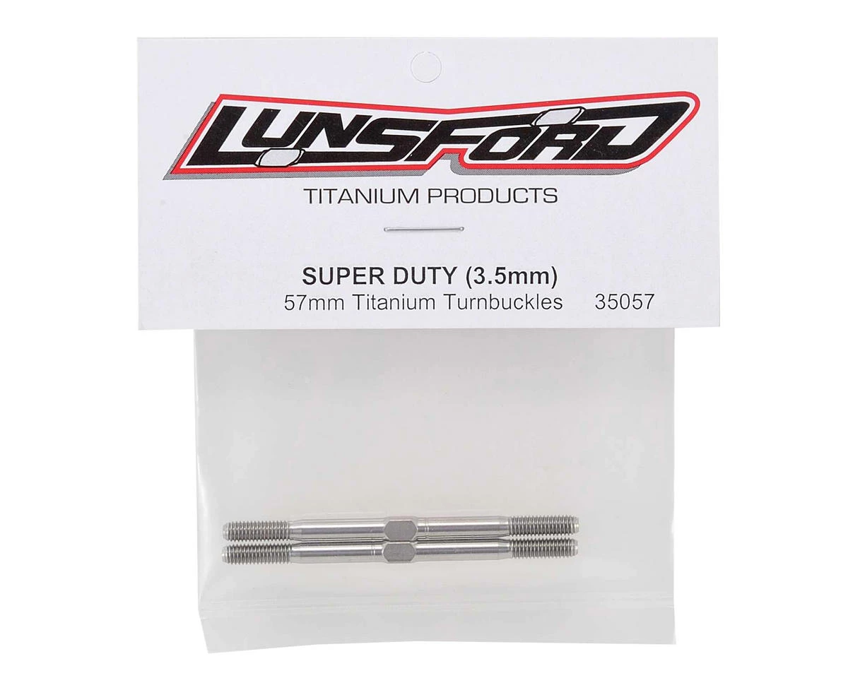 This is a set of two Lunsford “Super Duty” 3.5x57mm Titanium Turnbuckles. Lunsford turnbuckles are CNC machined and thread rolled in house from domestic US 6AL/4V grade titanium. If you want to put your car on a diet, this is one of the best places to start eliminating weight, without sacrificing strength.