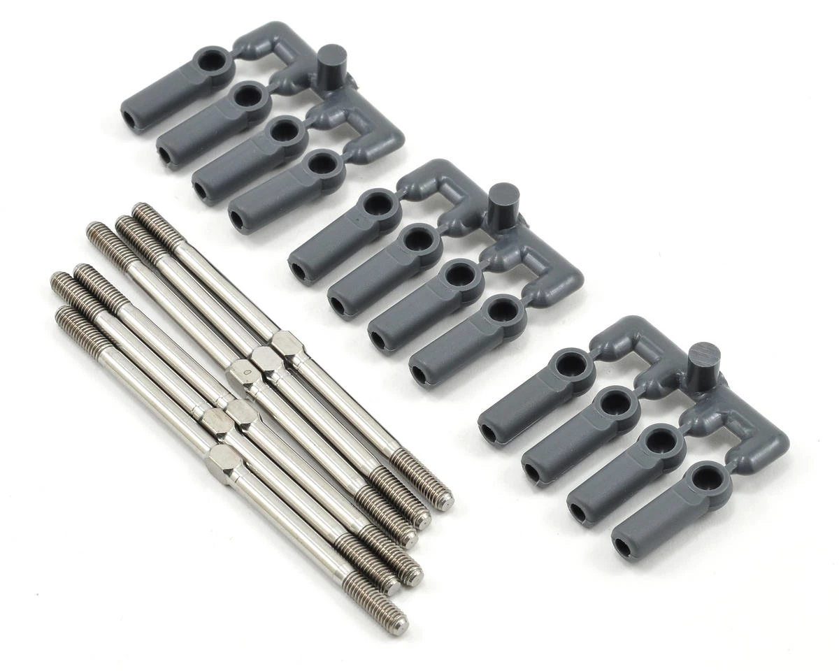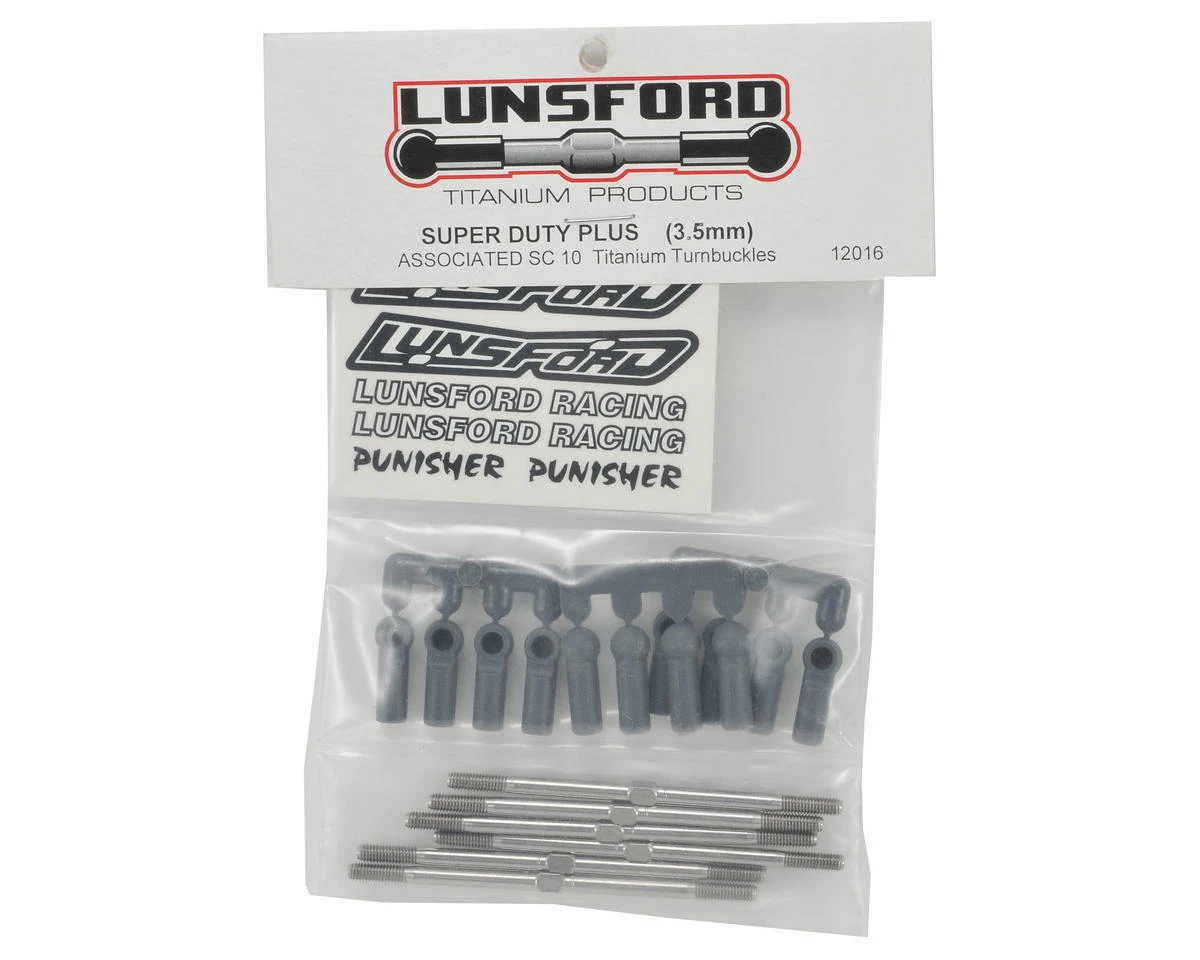 This is a optional Lunsford “Super Duty” Titanium Turnbuckle Kit, and is intended for use with the Associated SC10.Lunsford turnbuckles are CNC machined and thread rolled in house fromdomestic US 6AL/4V grade titanium. If you want to put your car on adiet, this is one of the best places to start eliminating weight,without sacrificing strength.Â