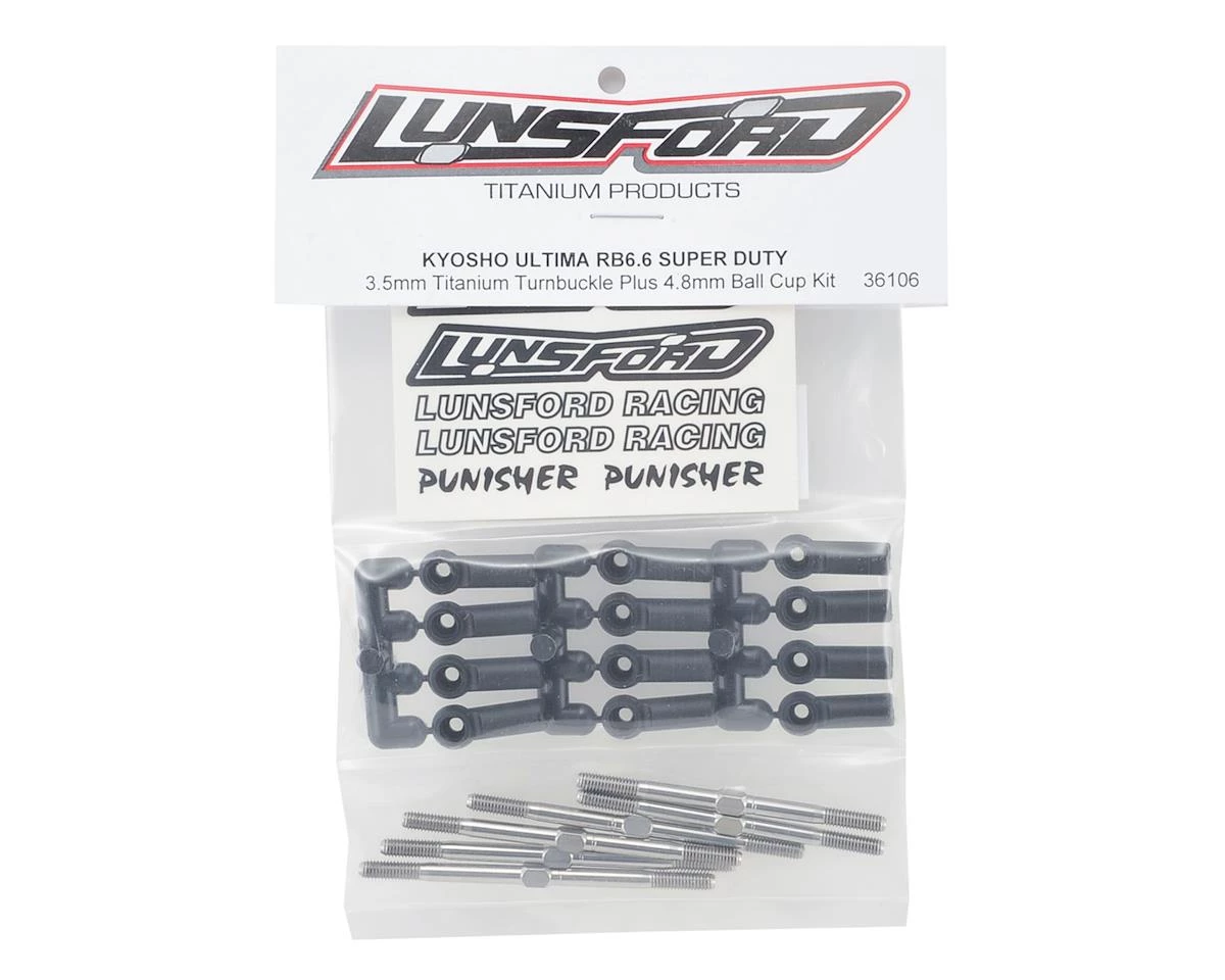 This is an optional Lunsford “Super Duty” Titanium Turnbuckle Kit, and is intended for use with the Kyosho Ultima RB6.6 vehicle. This kit also includes twelve Lunsford Super Duty 4.8mm ball cups. These turnbuckles are CNC machined and thread rolled in house from domestic US 6AL/4V grade titanium. If you want to put your car on a diet, this is one of the best places to start eliminating weight, without sacrificing strength.