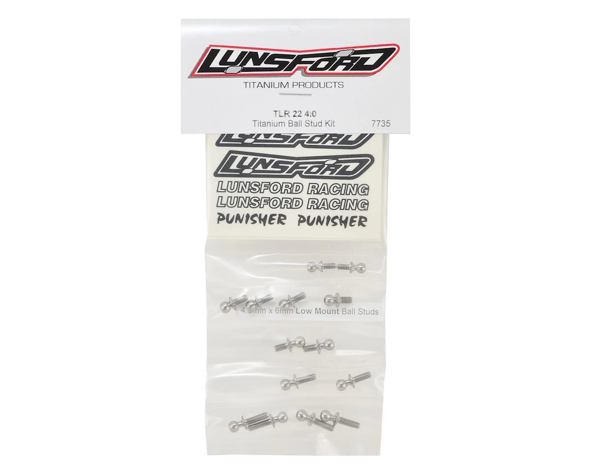 This is a pack of fourteen optional Lunsford Titanium Ball Studs for the Team Losi Racing 22 4.0 buggy. Get the strongest combination of all time with these titanium ball studs from Lunsford. All Lunsford ball studs are CNC micro finished from 6AL/4V titanium.