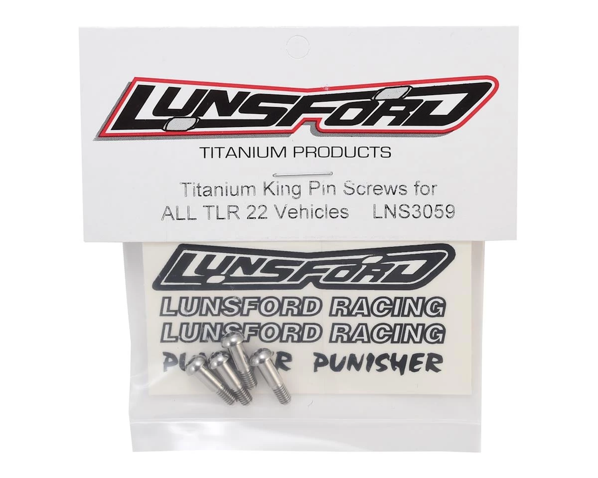 This is a pack of four optional Lunsford Titanium King Pin Screws, for use with the TLR 22 3.0/up, 22-4/up, 22T 3.0/up and 22SCT 3.0.Â