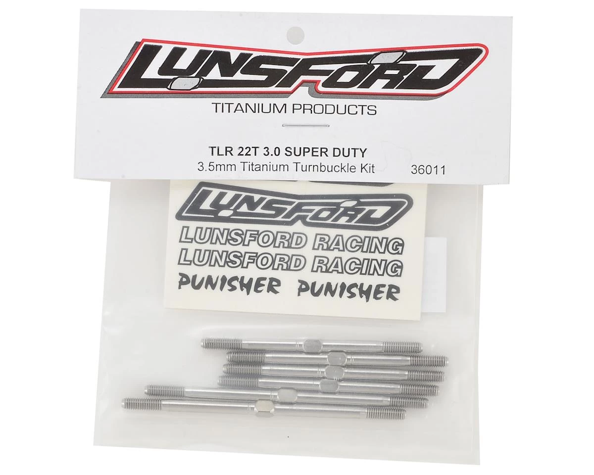 This is a Lunsford “Super Duty” Titanium Turnbuckle Kit, intended for use with the TLR 22T 3.0. These turnbuckles are CNC machined and thread rolled from domestic US 6AL/4V grade titanium. If you want to put your car on a diet, this is one of the best places to start eliminating weight, without sacrificing strength. Plus they work with the stock ball cups, making this a simple upgrade that will reduce weight and increase strength, delivering a dramatic performance gain.Â