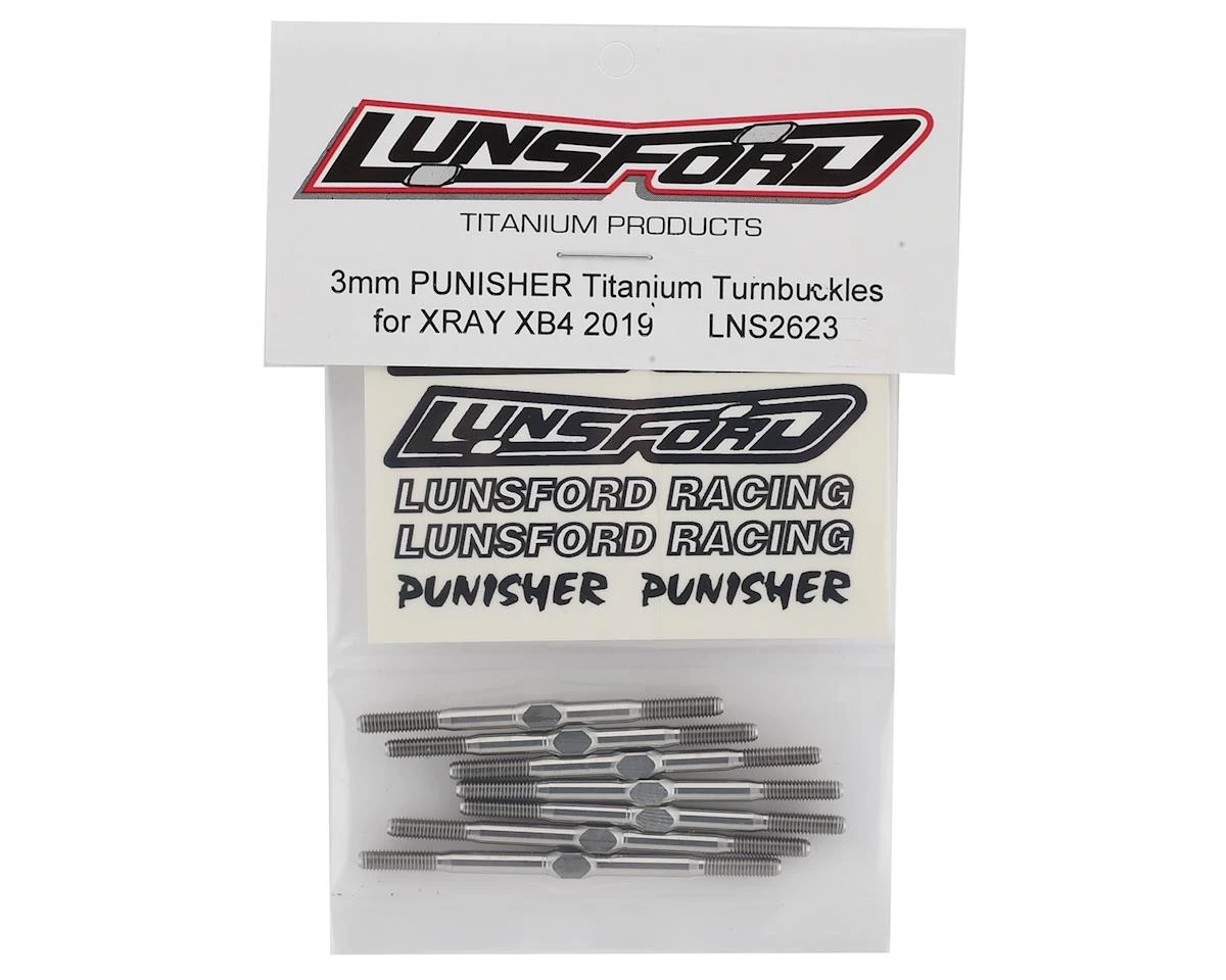 The Lunsford XRAY XB4 2019 “Punisher” Titanium Turnbuckle Kit is CNC machined and thread rolled in house from domestic US 6AL/4V grade titanium. If you want to put your car on a diet, this is one of the best places to start eliminating weight, without sacrificing strength.