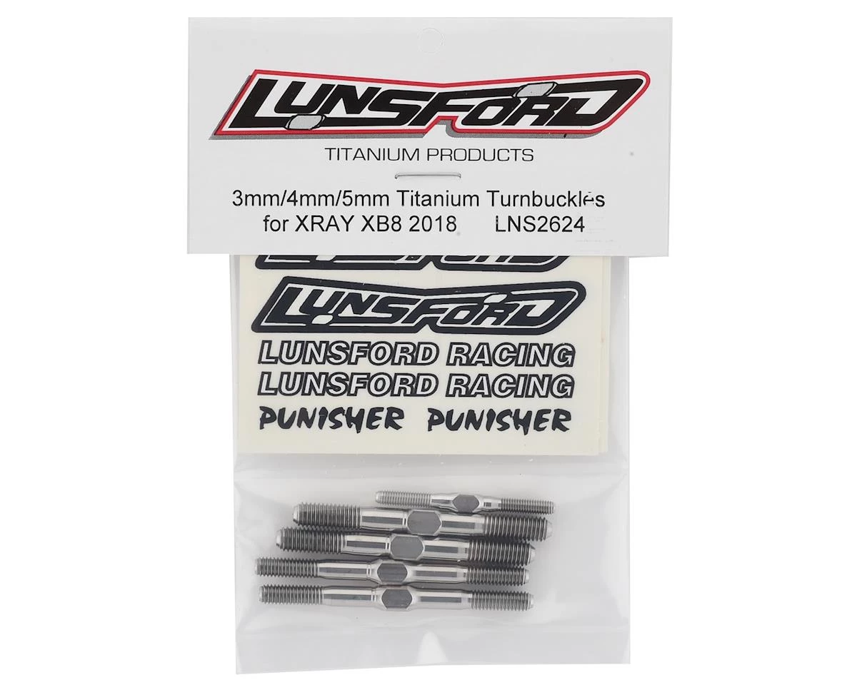 The Lunsford XRAY XB8 2018 “Punisher” Titanium Turnbuckle Kit is CNC machined and thread rolled in house from domestic US 6AL/4V grade titanium. If you want to put your car on a diet, this is one of the best places to start eliminating weight, without sacrificing strength.